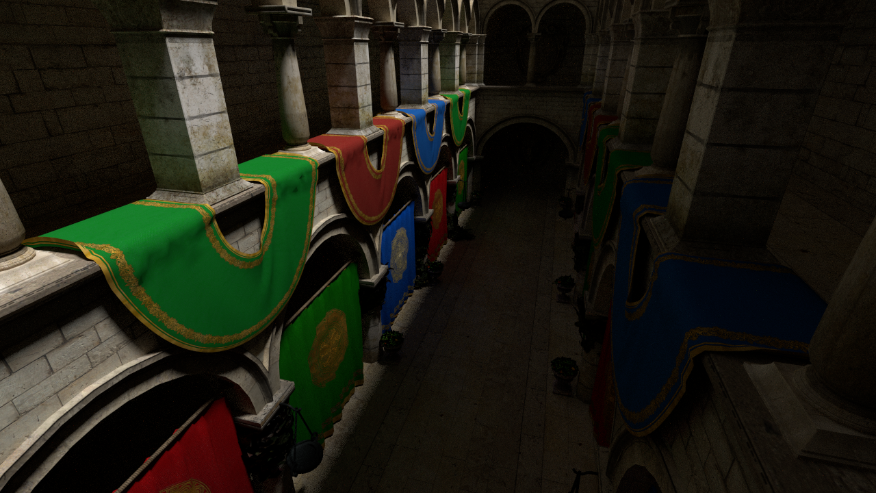 One optimization to consider that wasn’t implemented in my application is to separate the indirect lighting calculation from voxel cone tracing at a lower resolution. The higher the resolution the more surface points that need to be cone traced since each pixel represents a position in scene. A disvantage of doing this is that it creates some notable artifacts, though they can be somewhat reduced through clever use of screen-space techniques.
